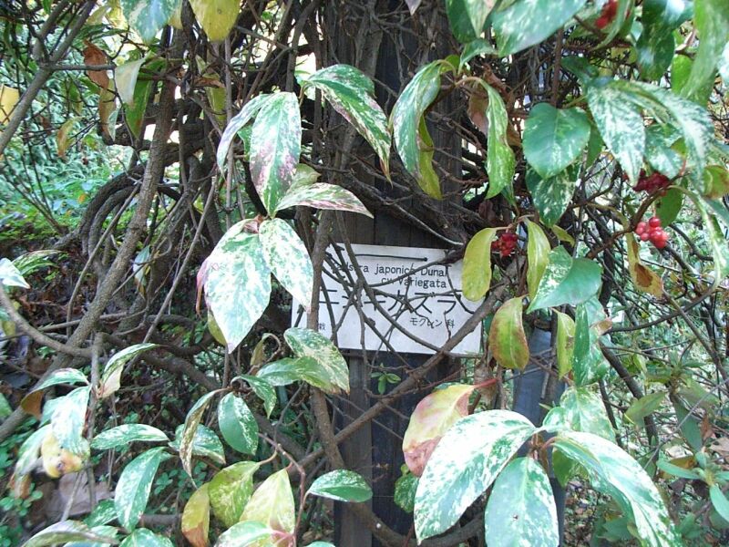 葉には赤、黄色、白と様々な色の斑が入り、革質の無毛である。