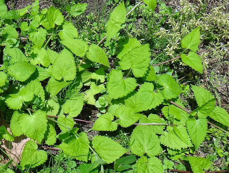 葉は長さ2〜5センチの三角状心形で、対生し、鈍い鋸歯がある。