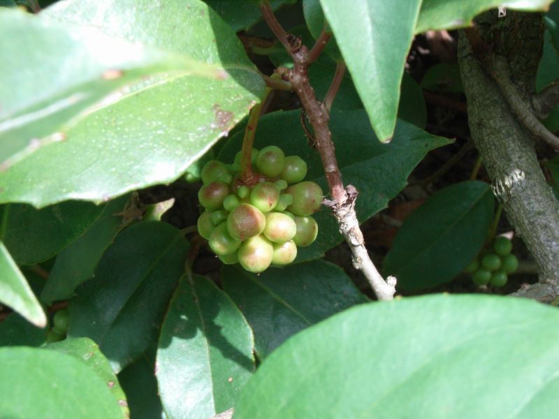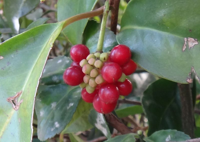 サルトリイバラ:葉に光沢があり葉脈が3〜5本、茎に棘。巻きひげ。赤熟。