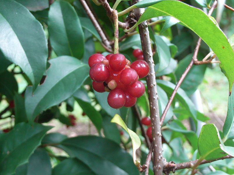 赤い液果の中には、淡褐色で腎形の種子が1〜3個入っている。
