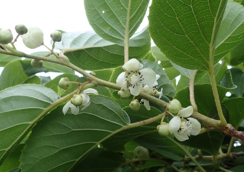 キウィフルーツ:樹皮灰白色で平滑、花数少、葯が黄色、果実は約8センチ、褐色、毛あり。