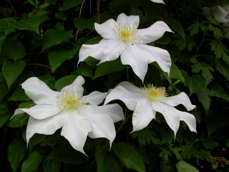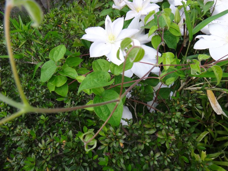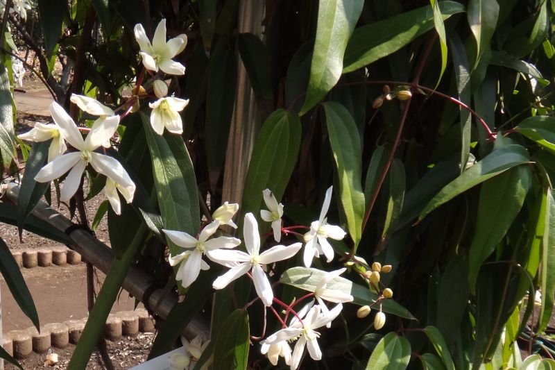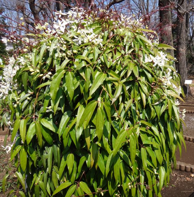 クレマチス・アルマンディは萼片が細長く、葉も細長い。