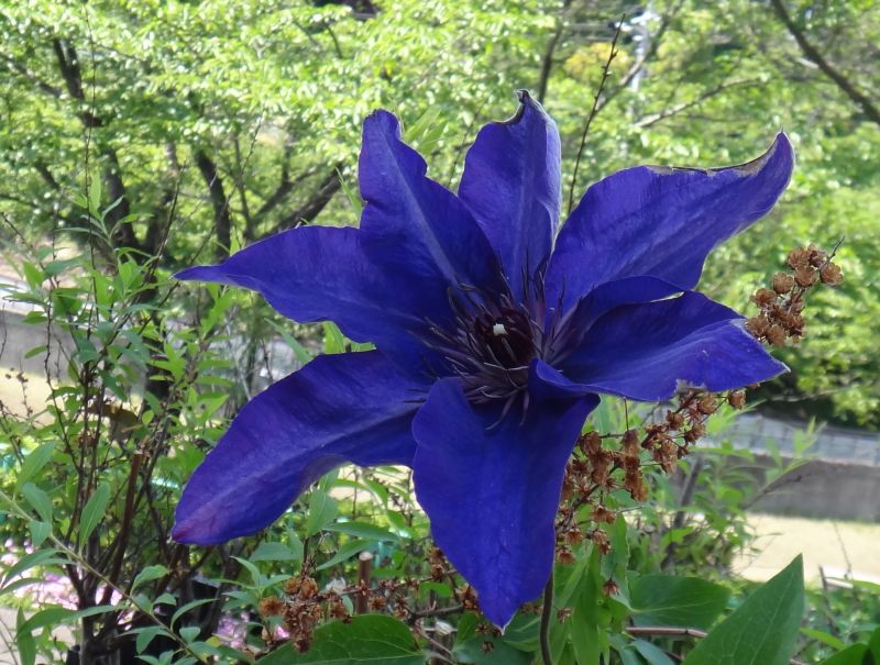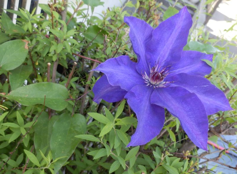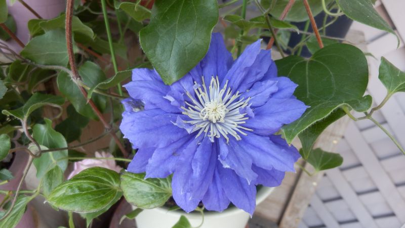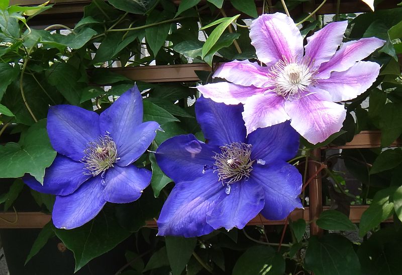 紫色の筋のあるのはクレマチス、青いのはテッセン。