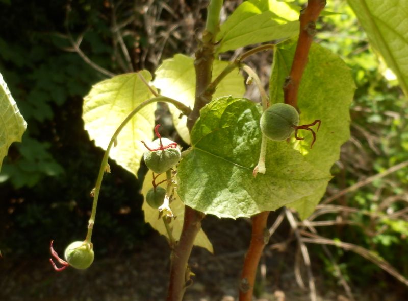 雌花の柱頭が赤く、丸い乾果ができる