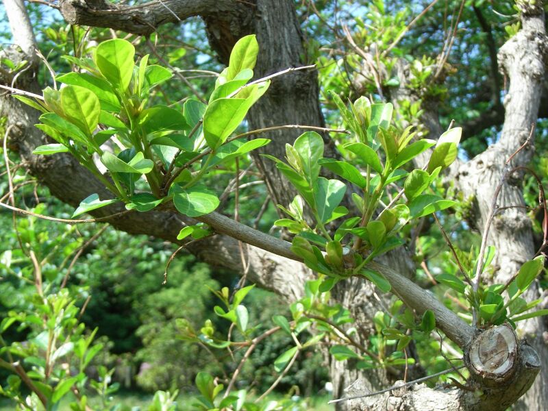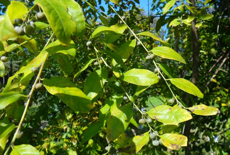 葉は両端のとがった長楕円形で、夏に葉腋に淡黄緑色の小さい花が咲き、