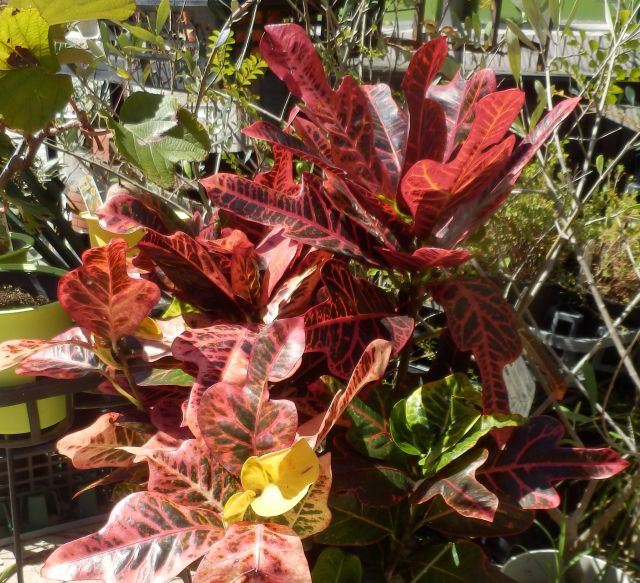 葉は赤、黄、緑、藍など多彩で、形も卵形、細長、螺旋状など、変異が多い南方の植物