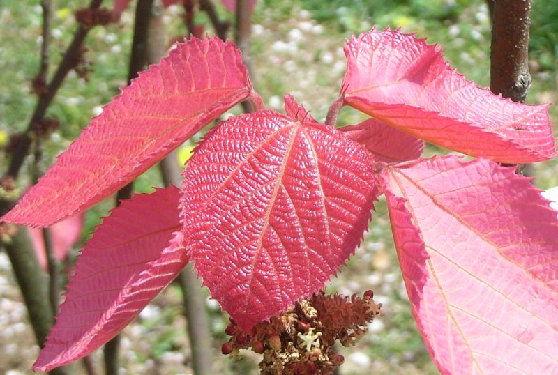 葉は円心形で鋸歯があり、若葉は紅色で、
