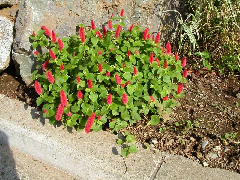 茎はよく分枝し、葉は広卵形で鋸歯があり、円柱状の花穂が赤くて長い毛で覆われる