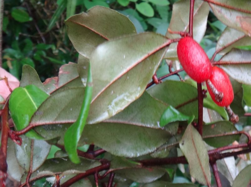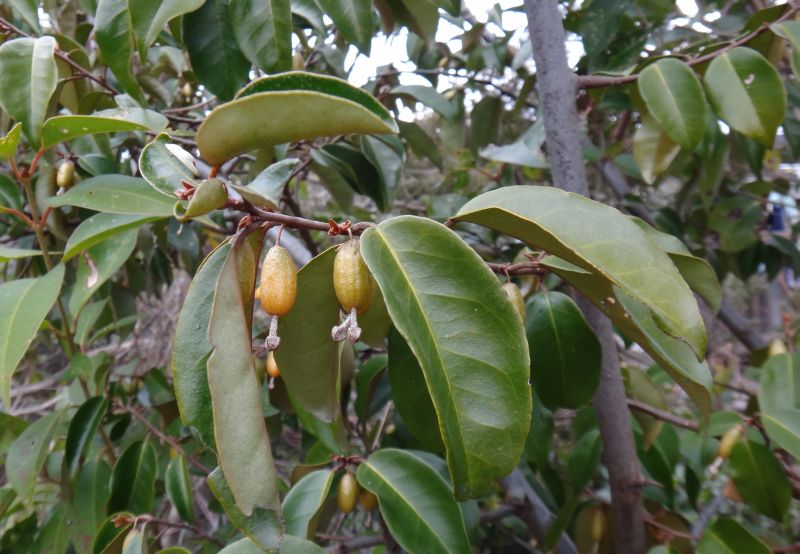 ツルグミ :春に咲き、長楕円形の果実が初夏に実り、枝が蔓状にのび棘がない。