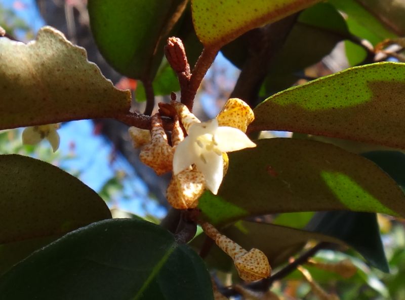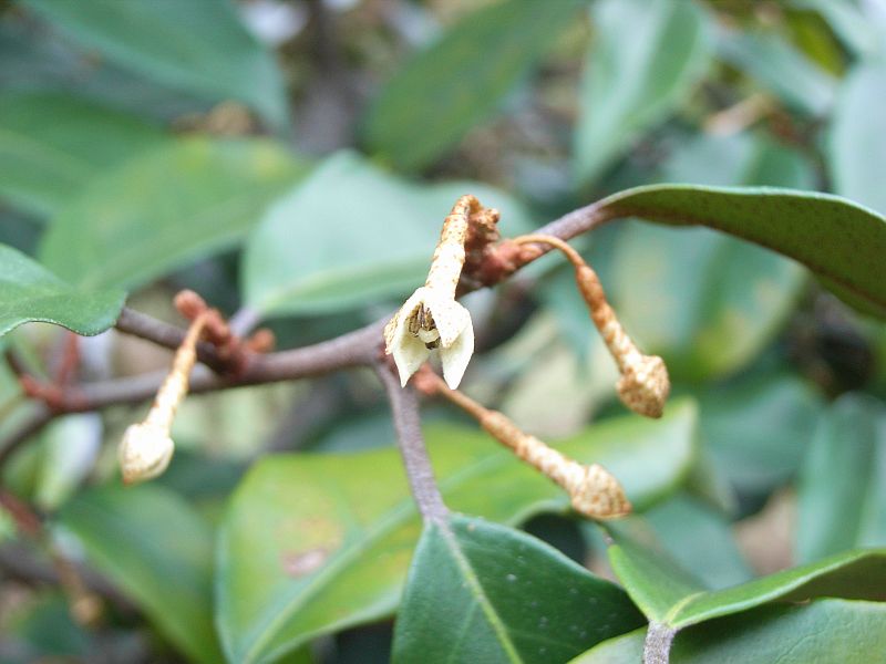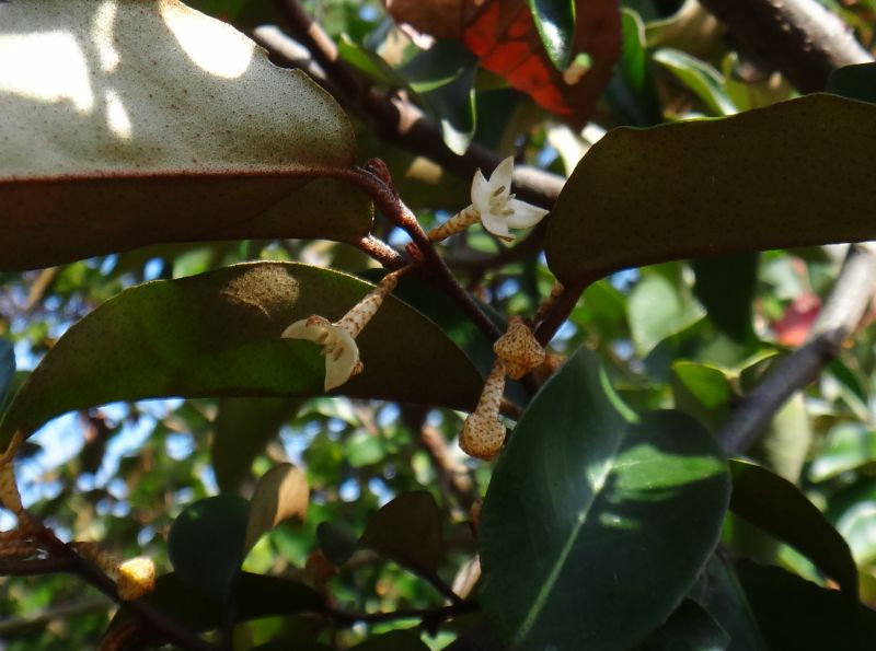 マルバグミ :葉は5〜10センチと大きく、革質で光沢があり、秋に咲き、長楕円形で白っぽい果実が翌春に熟す。