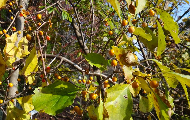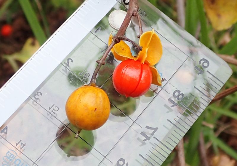 果実は直径7〜8ミリの球形の朔果で、10月〜12月に黄色に熟し、