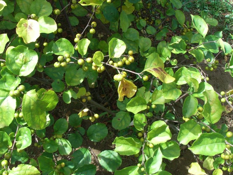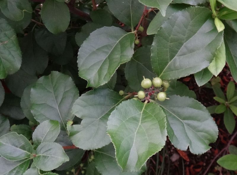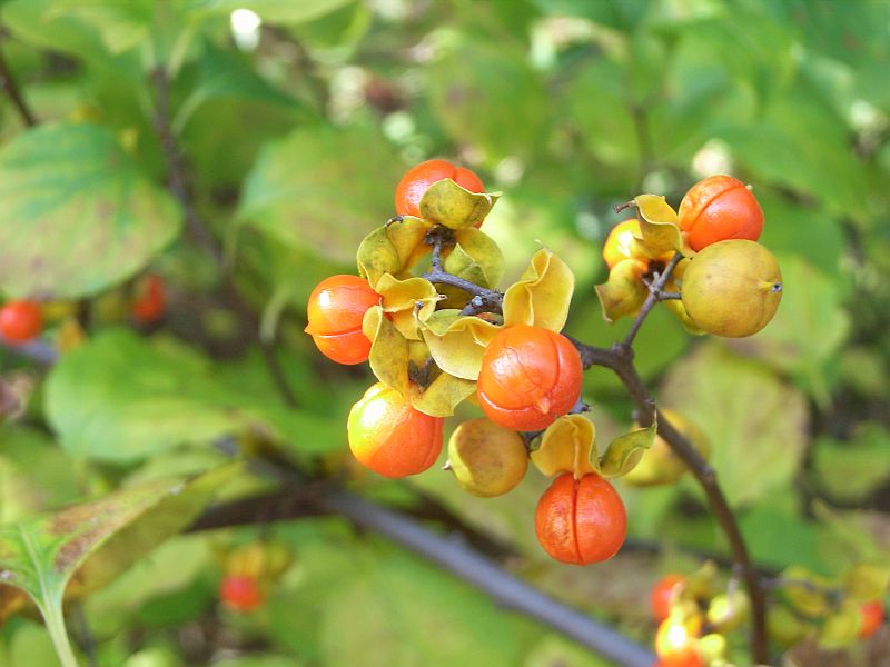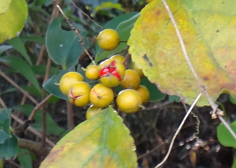 刮ハは直径7〜8ミリの球形で、果皮が3裂すると赤い仮種皮が現れる。