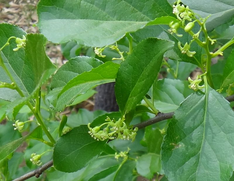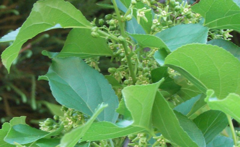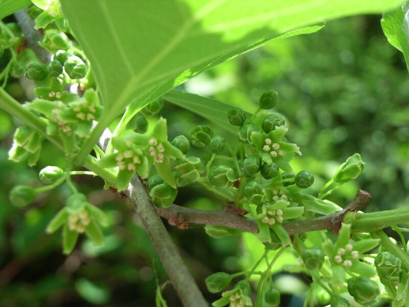 葉腋の集散花序に黄緑色の小さい花をつける。
