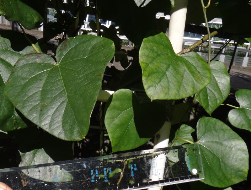 基部はハート形で5〜10センチの長い葉柄につく。