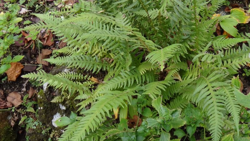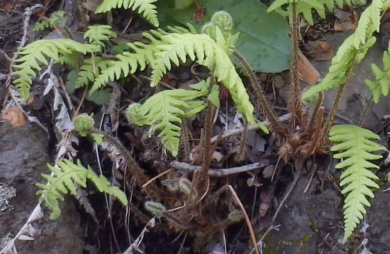 小羽片は先端では短く、中ほどでは長く、基部では短くなる。 鱗片は線状で、葉柄の基部に多くつく。 小羽片には両面ともに毛がある。