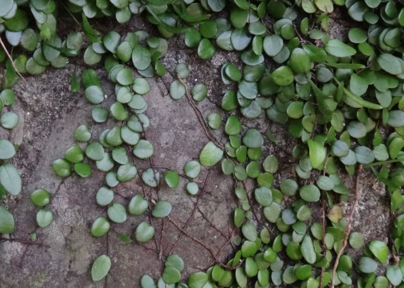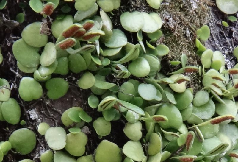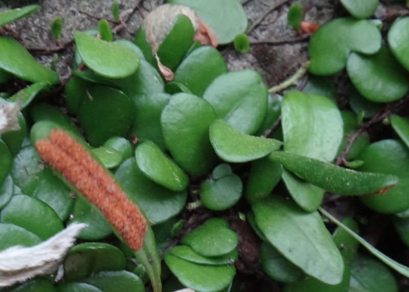 肉厚で数ミリの葉柄があって、樹皮などにかぶさる。