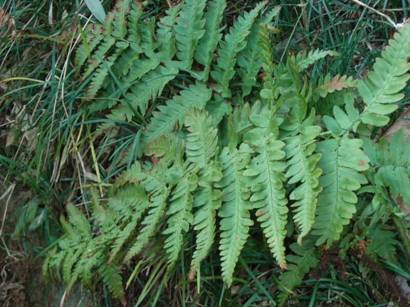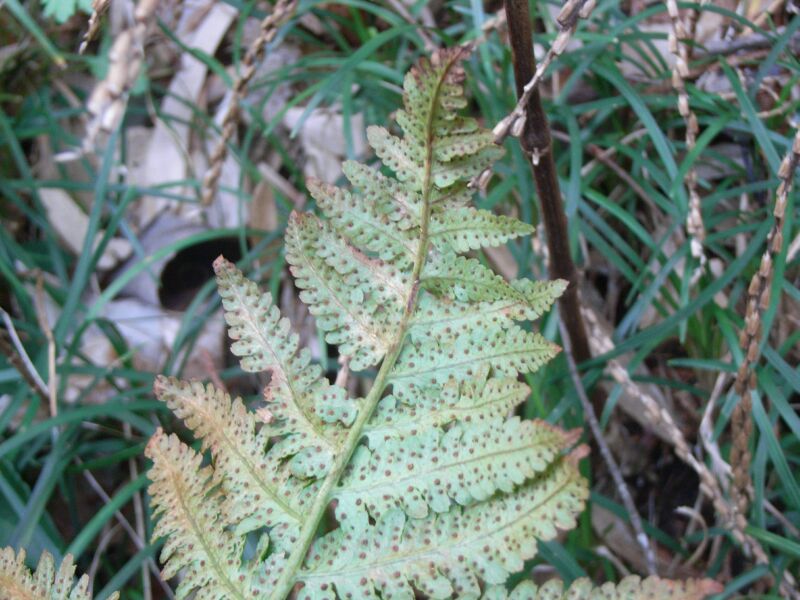 クマワラビ :葉柄に褐色鱗片、葉脈くぼむ、鋭頭、先端の羽片はやや縮み胞子散布後枯れる。