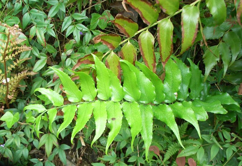 葉身は1回羽状複葉で、側羽片は鎌状長楕円形で7〜18対あり、厚く、