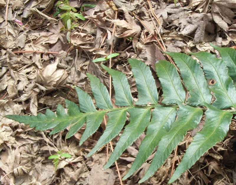 1回羽状複葉が斜上する。羽片は三角状被針形で革質である。