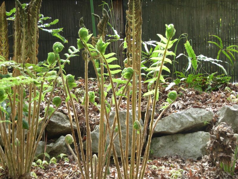 新芽は渦巻き状で、葉は2回羽状複葉であり、 小葉は細長く先の丸い三角形である