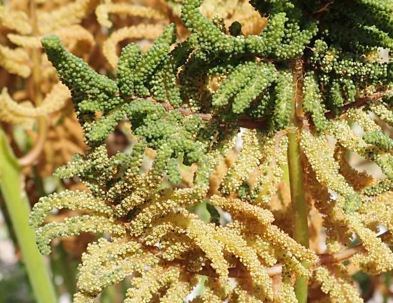 胞子葉。緑色の丸いのは胞子を出す前の胞子嚢、褐色のは胞子を出したあとの胞子嚢。(2017/4/13)