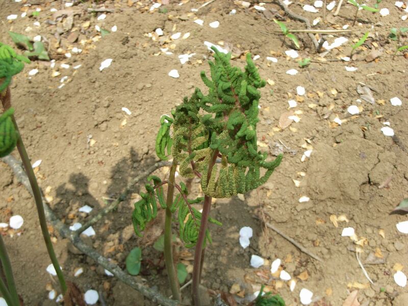 渦巻き状の新芽には、胞子葉となる男ゼンマイと、