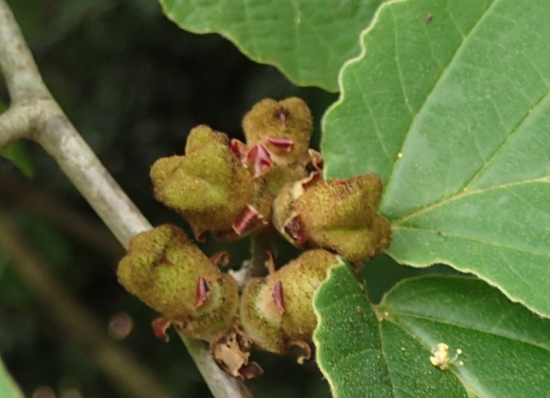 アカバナマンサク:葉は広卵形で、萼も花弁も赤く、1月から咲く。