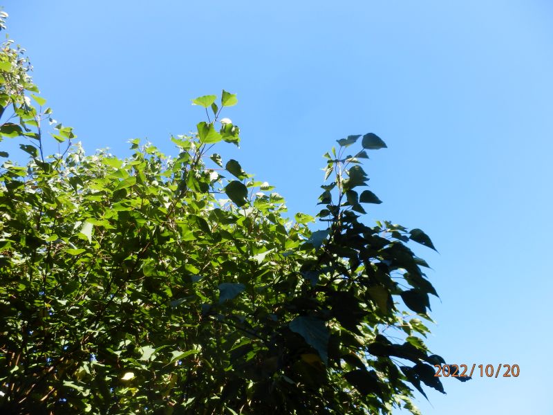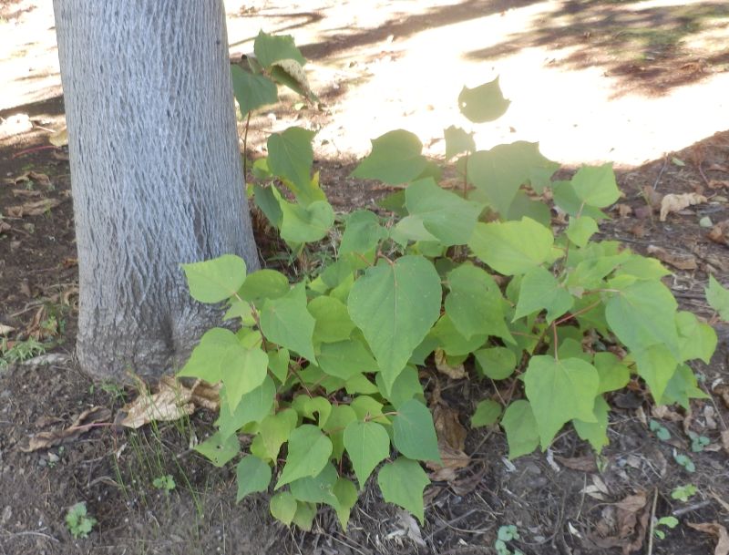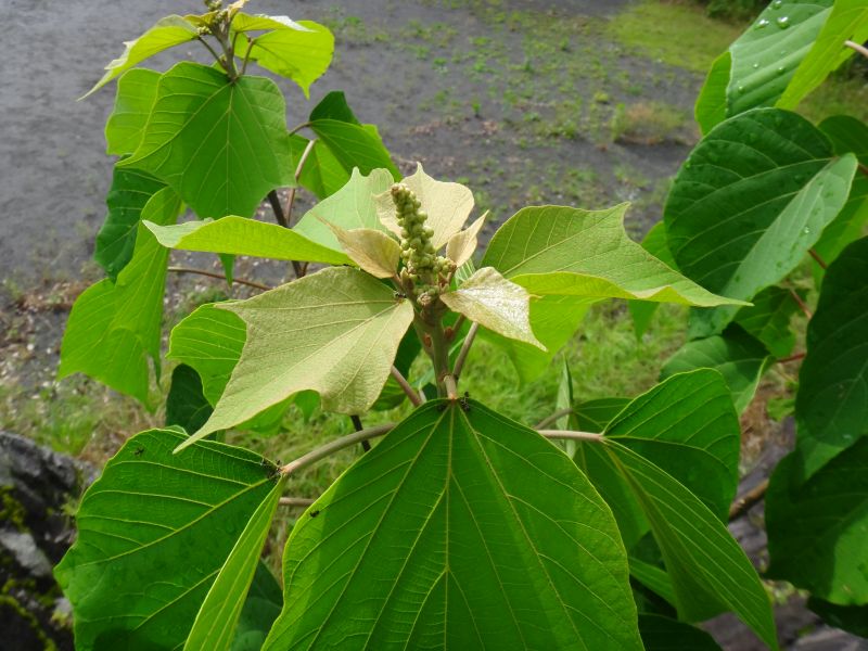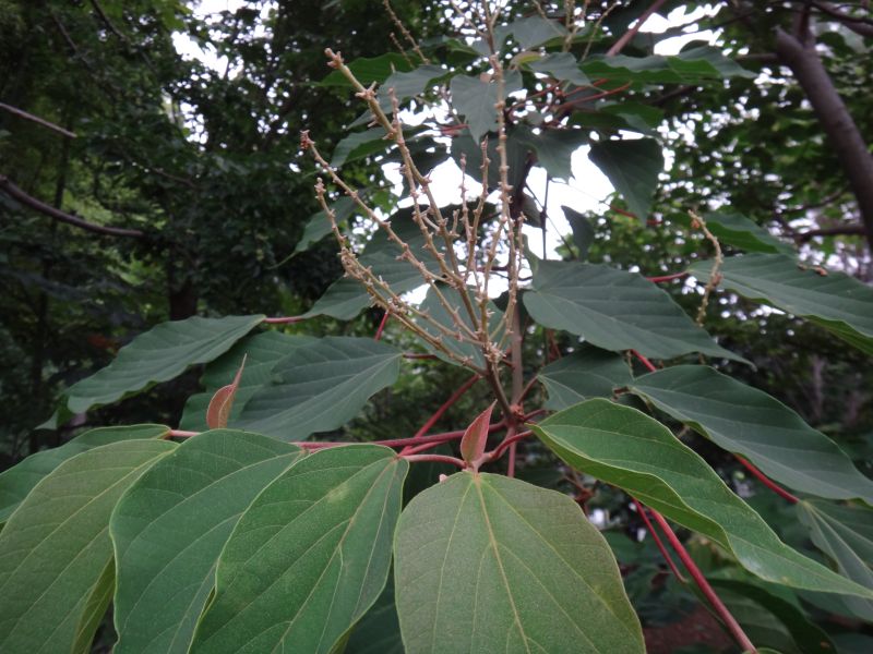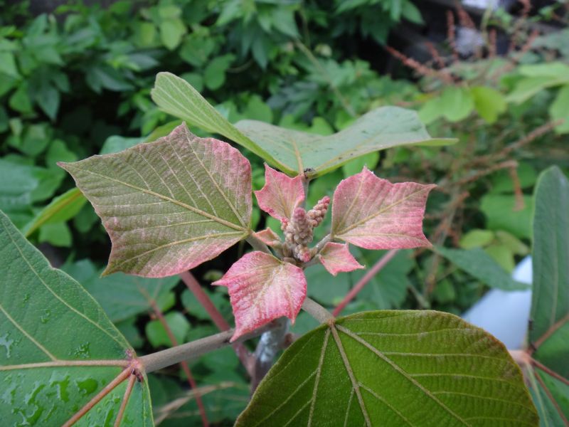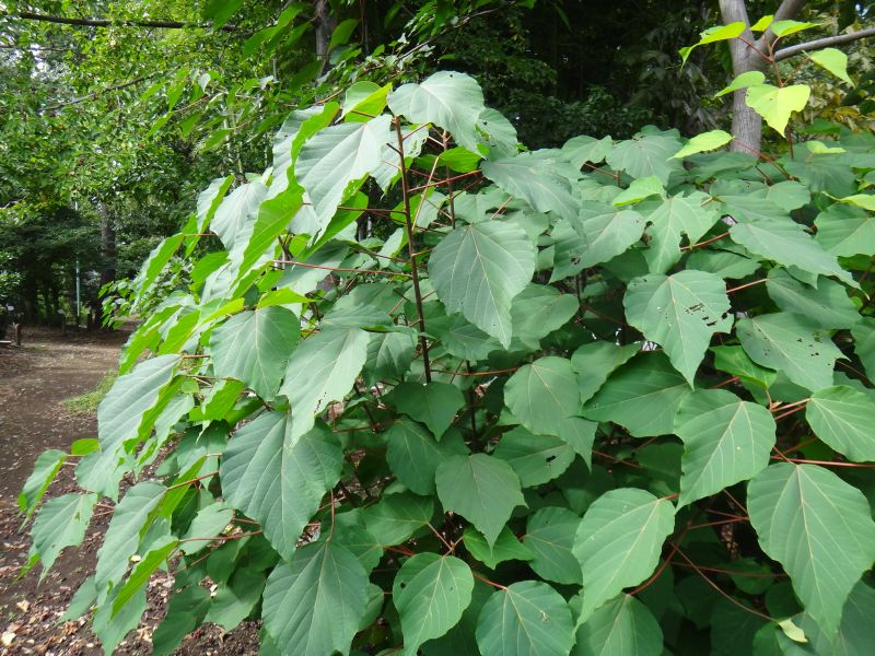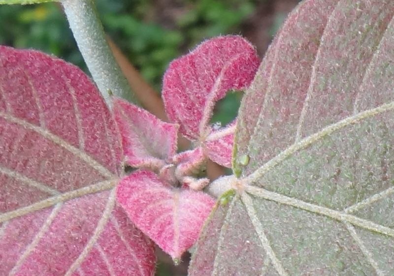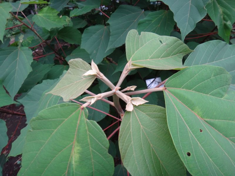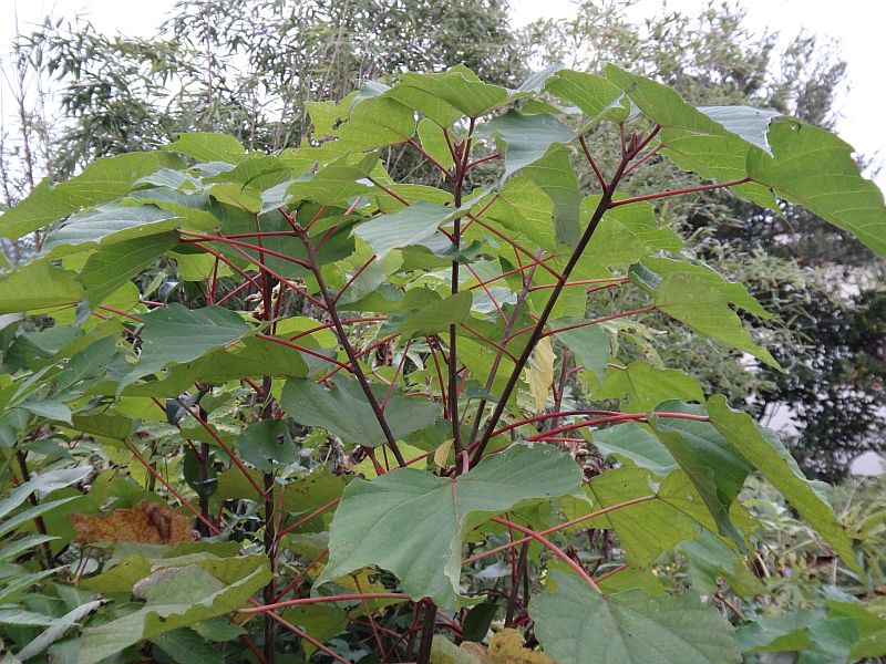 葉は広卵形で互生し、葉柄が赤く、全縁で3浅裂する。若枝には星状毛がある。(2011/12/5)