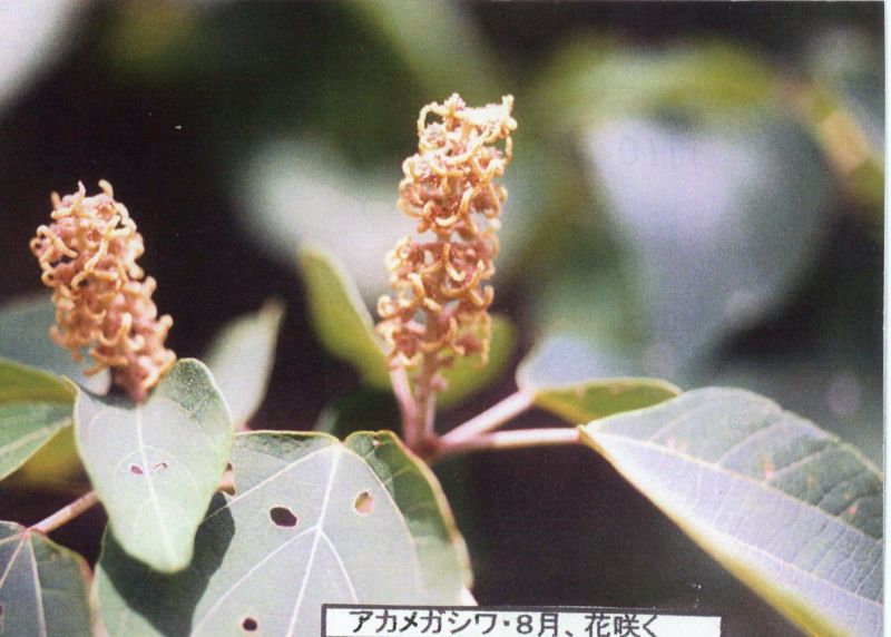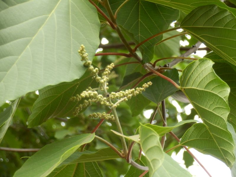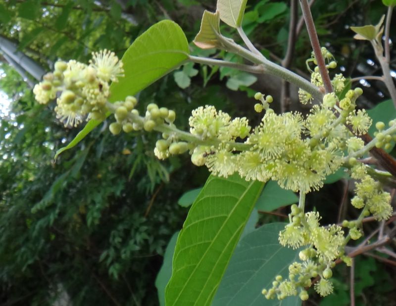 淡黄色の萼が3〜4裂した花をつける。雄花は多数の雄しべが伸びて目立つが、