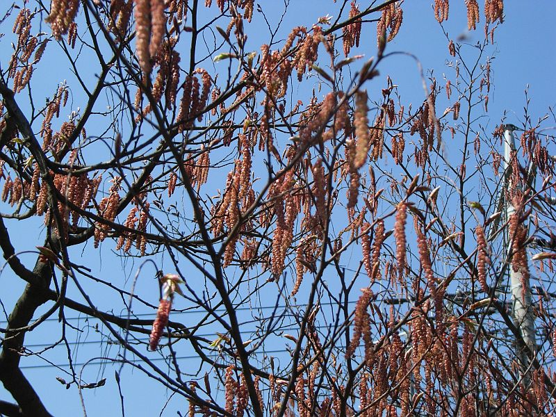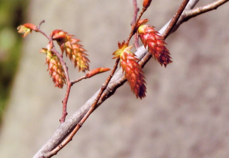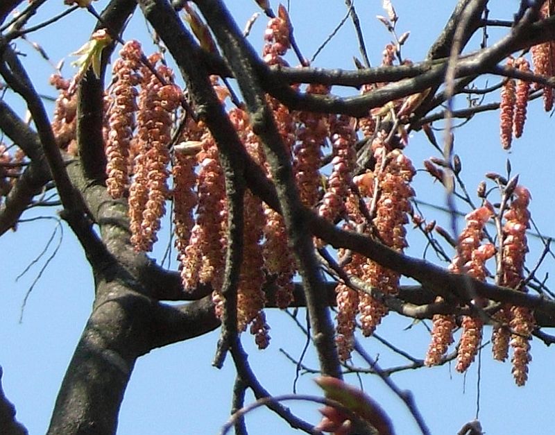 葉の展開と同時に開花し、雄花序は黄褐色で赤い苞をもち、