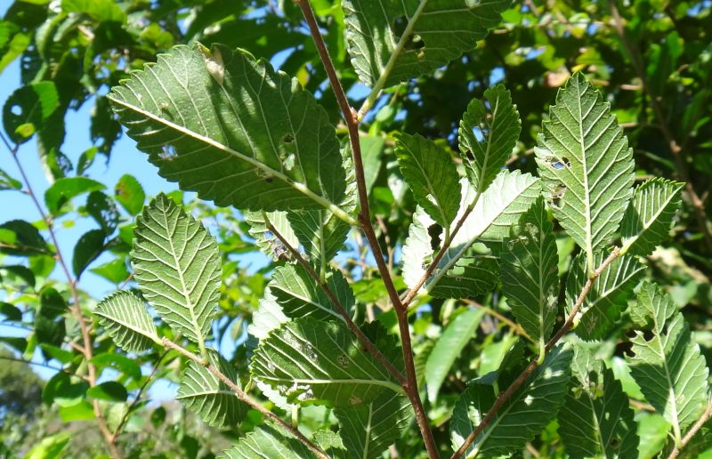 葉は互生し、鋸歯のある長楕円形で、光沢がある。若枝には短毛がある。