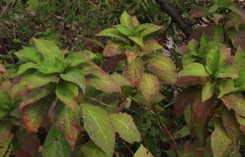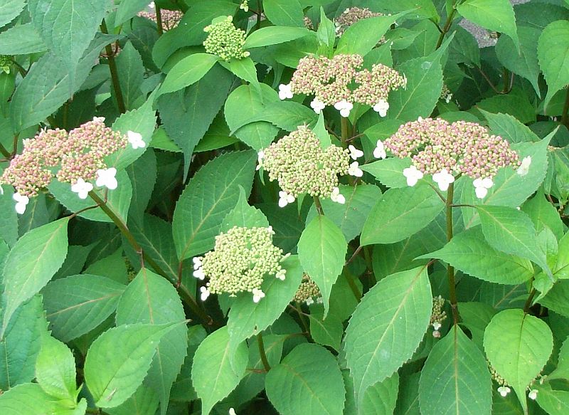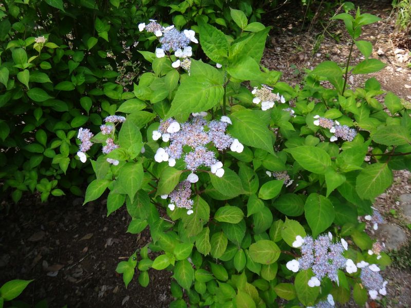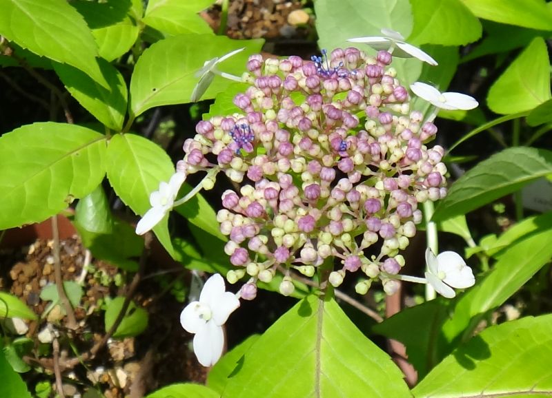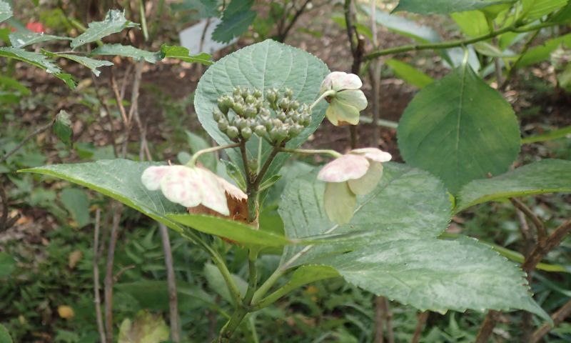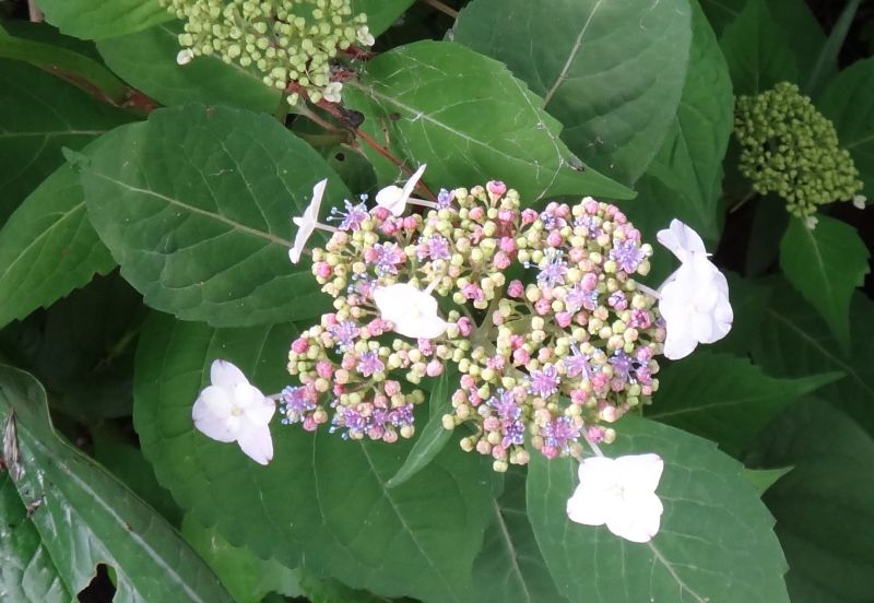 装飾花の萼片は、はじめ淡紫色であるが、やがて淡紅色に変わる。