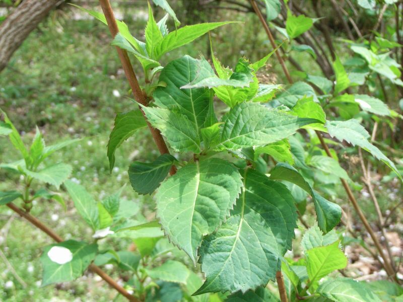 葉は倒卵状楕円形で、鋸歯があり、対生する。枝は紫褐色を帯びる。