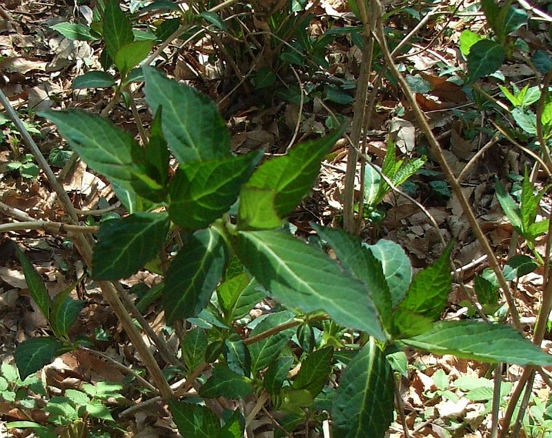葉は長さ5〜10センチの倒卵状楕円形で、鋸歯があり、対生する。