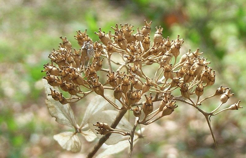 まわりに装飾花のあるガクアジサイのような花を咲かせる。