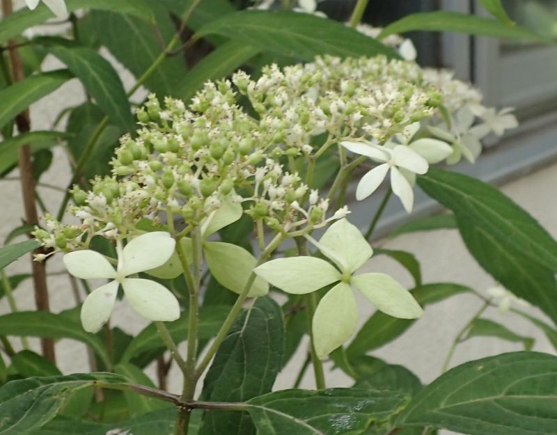 中央部に両性花、周辺部に装飾花がつき、色は白い。