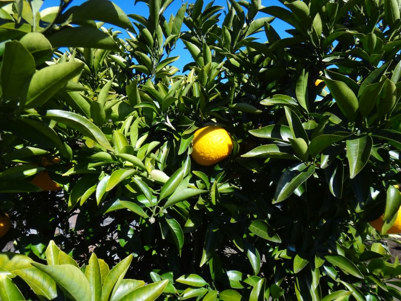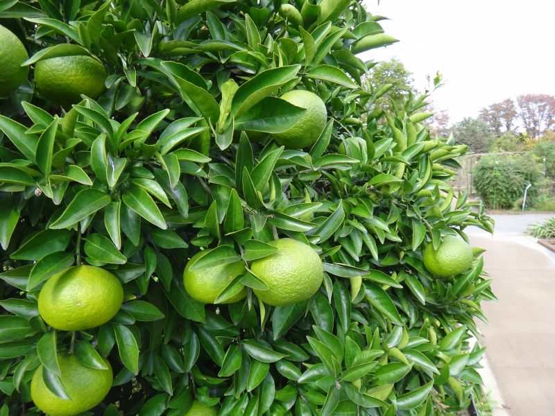 果実は球形のミカン果であり、翌年の4月〜6月に黄色く実る。
