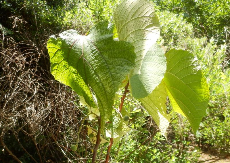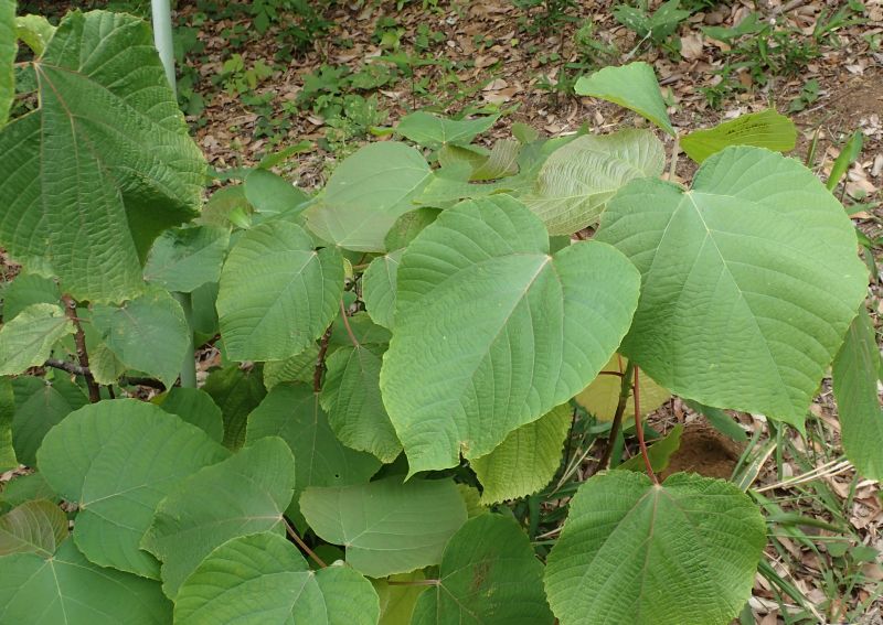 葉脈は紅色を帯び、長い葉柄も紅色を帯びる。