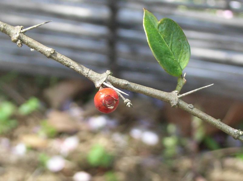 直径5ミリぐらいの球形の核果をつけ、秋に赤く実る。