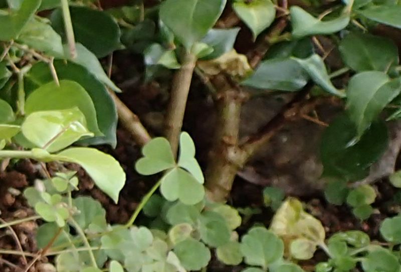 葉は対生し、長さ7〜20ミリの卵形で全縁であり、大小2つの形の対が交互に付く(大小の区別がはっきりしない場合もある)。