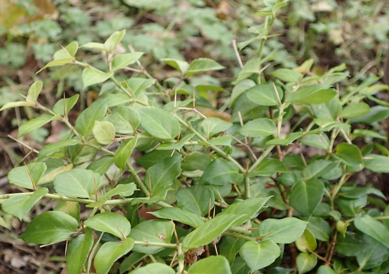 春に枝先や葉腋に白い花を2つずつつける。