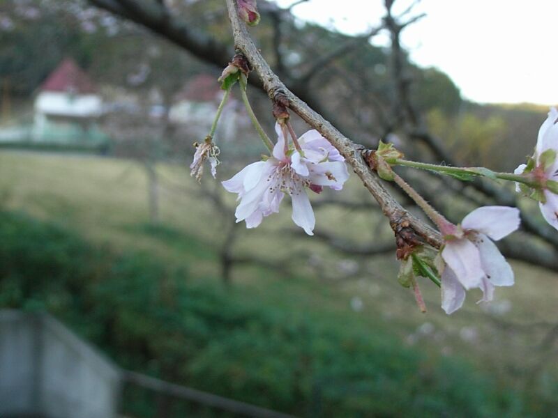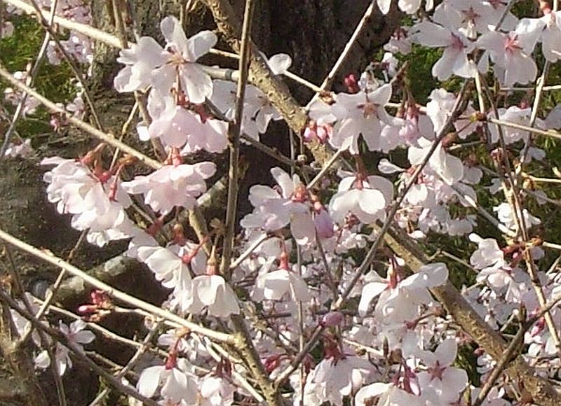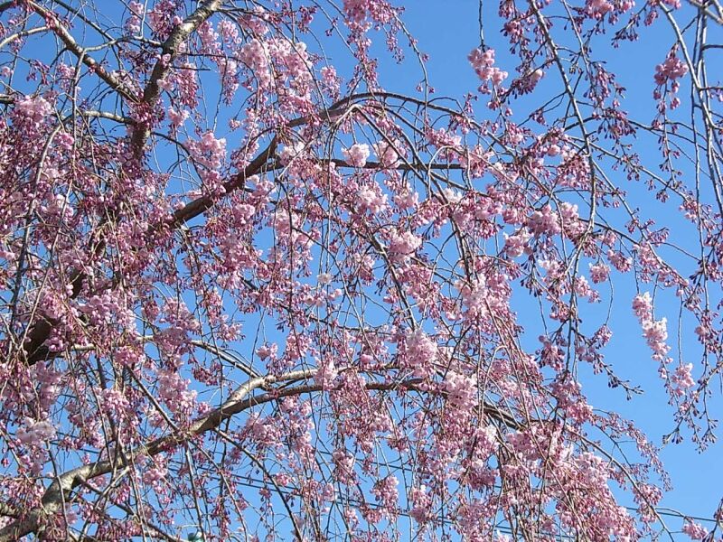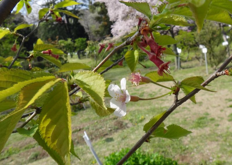 多くのサクラに先立って、濃い紅色の花が垂れ下がって咲く