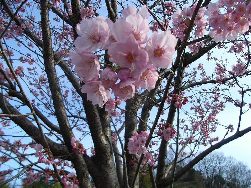 彼岸の頃、ソメイヨシノより少し濃い5弁の薄紅色の花を咲かせる