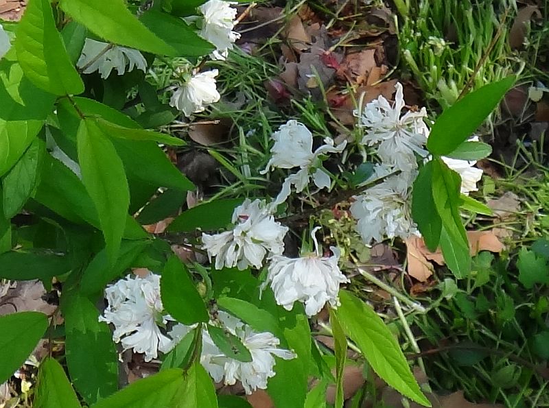 低木で株立ちし、白〜淡紅色の八重の花が咲き、結実しない
