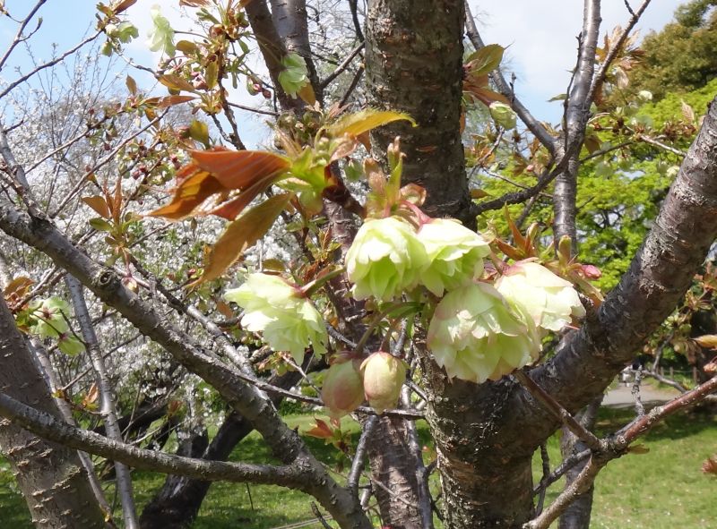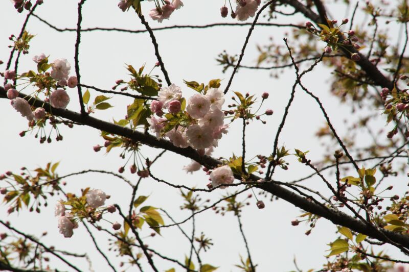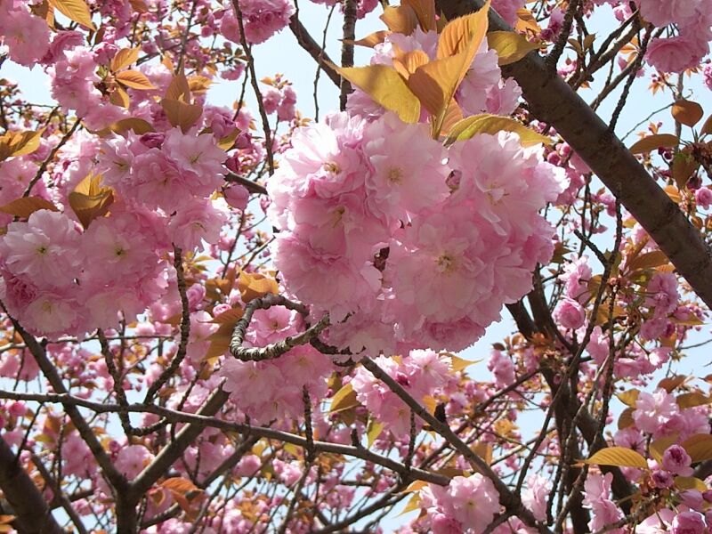 花弁のたくさんある花がソメイヨシノより遅れて葉と一緒に咲く