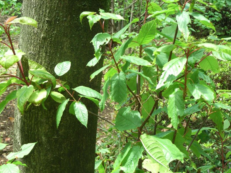 枝が垂れ下がり、若枝、葉、花柄、萼は有毛