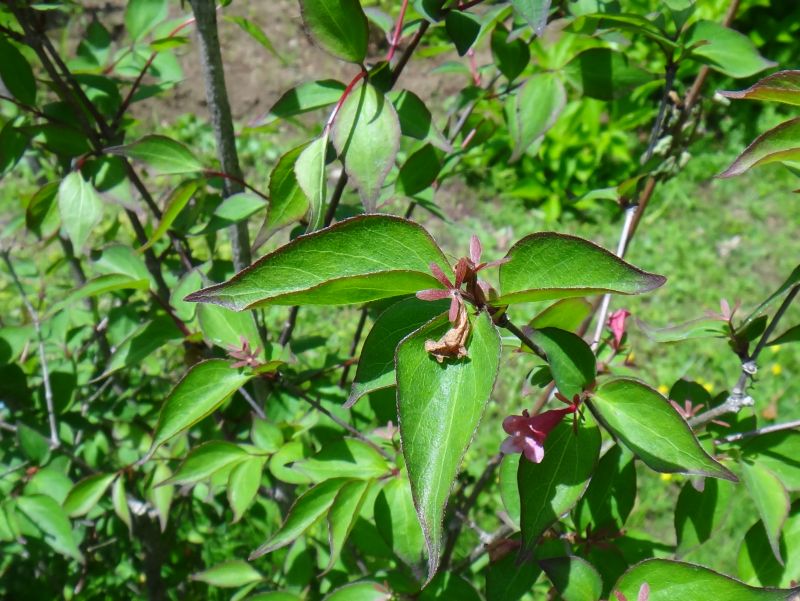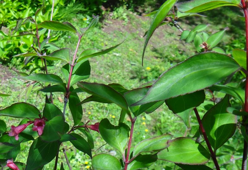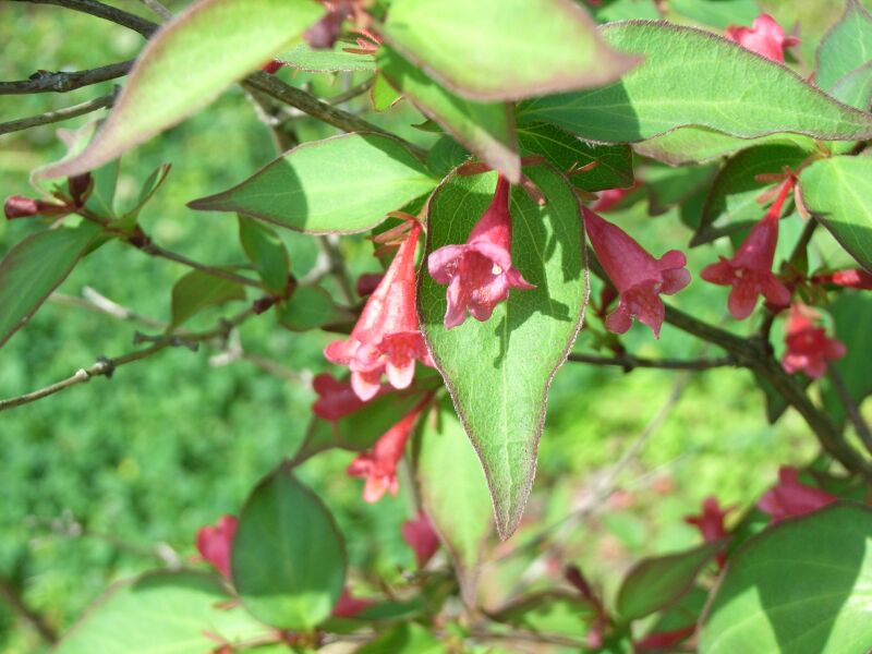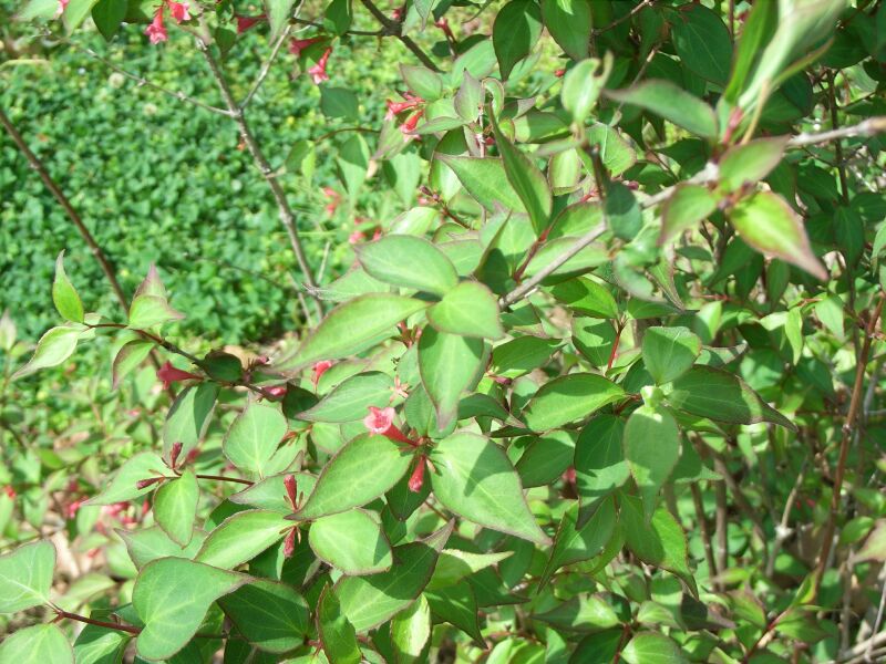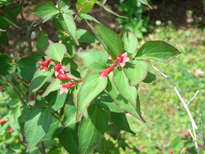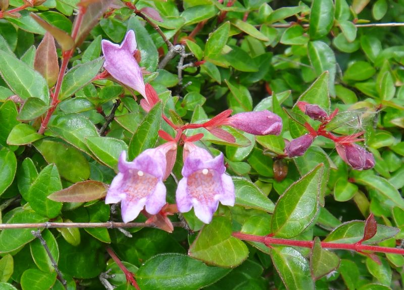 ベニバナツクバネウツギ:花は紅で2〜3センチのが2個ずつつき、内側に橙色の網目模様あり、萼5枚。
