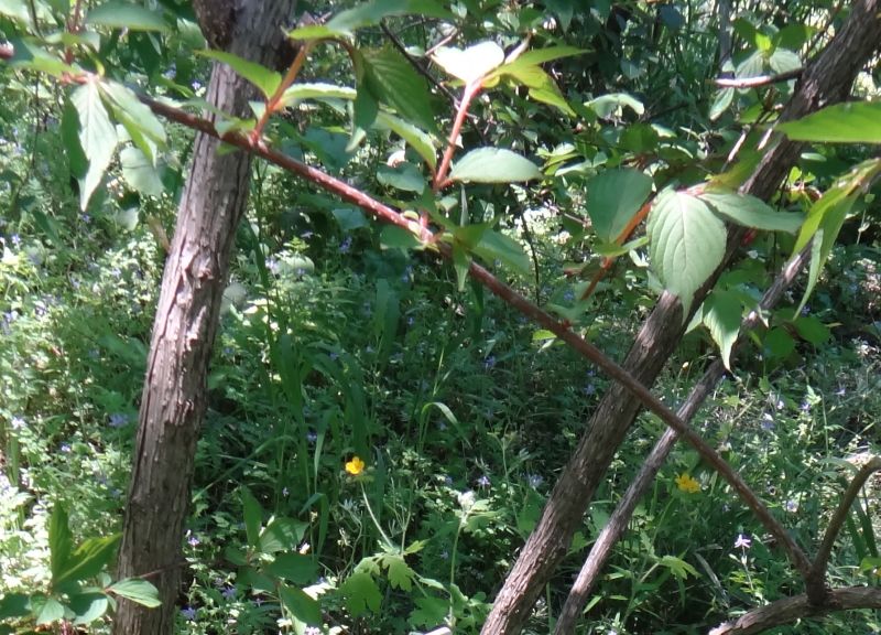 ヤブウツギ :花は濃い紅色、萼と若枝に開出毛密生、葉裏にも開出毛。