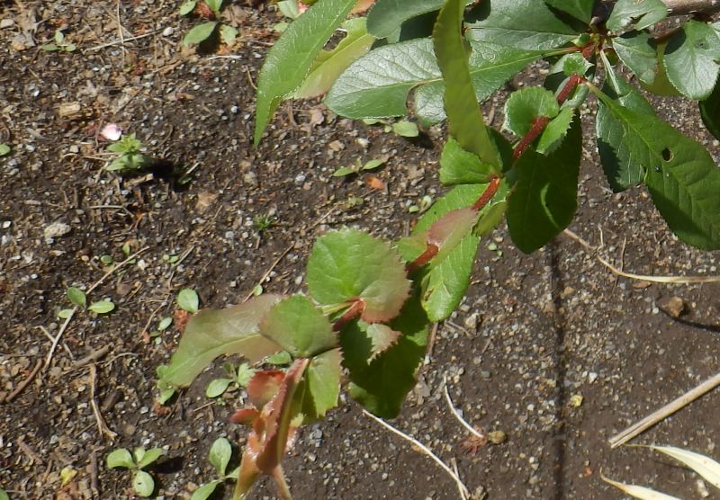 長枝では葉が互生する。葉の基部に丸い托葉が2枚ある。(2016/4/15)