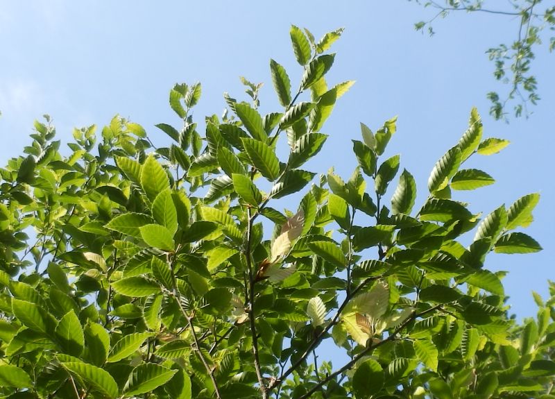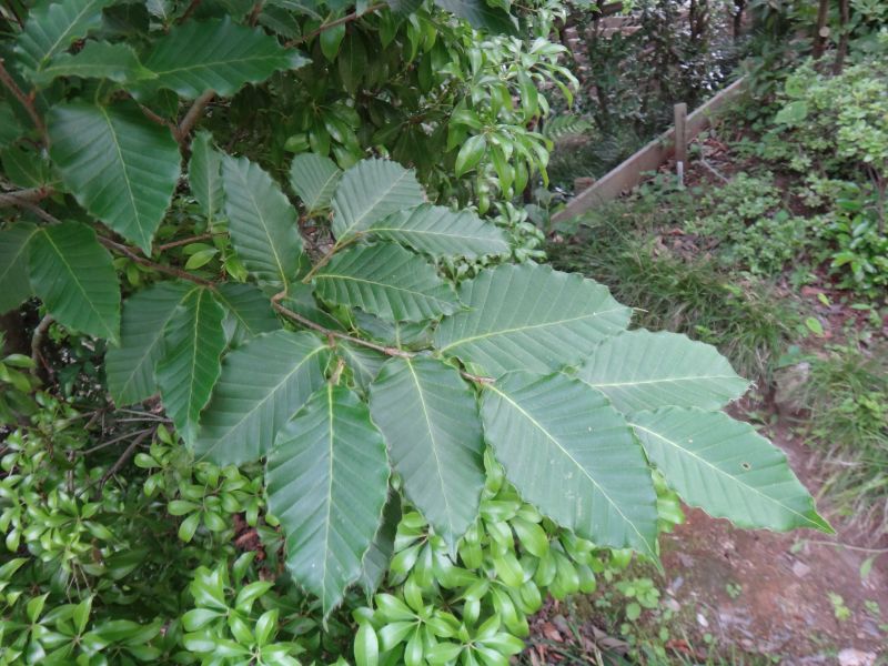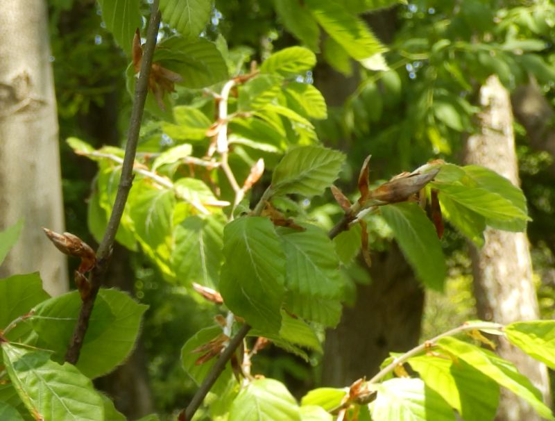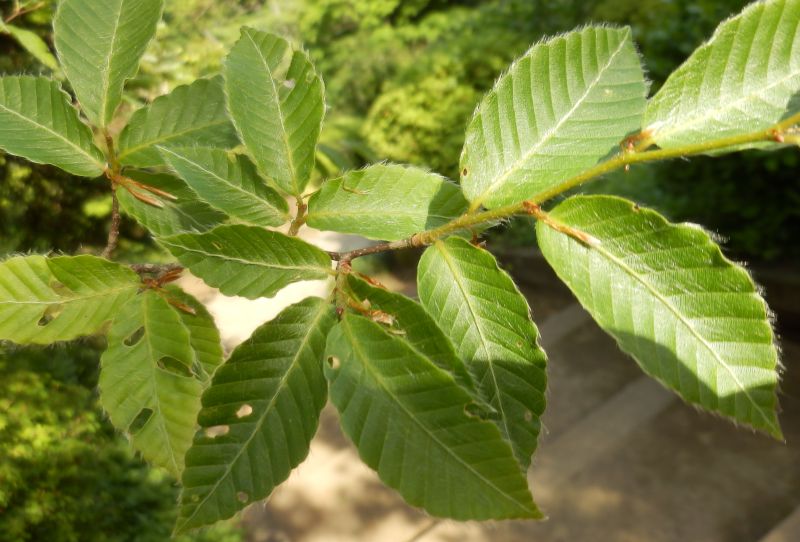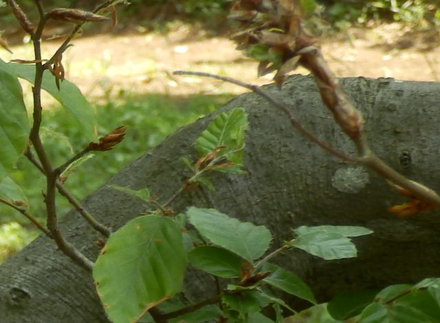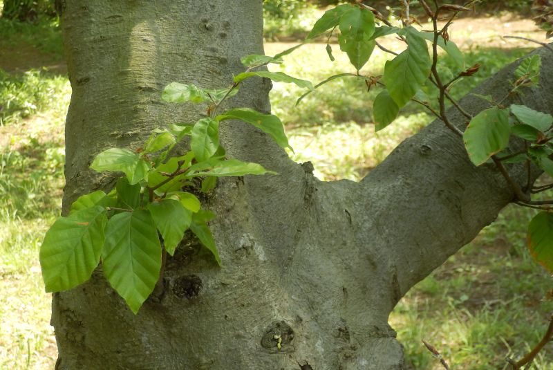 ブナ :ひこばえなし、樹皮灰白色、側脈7〜11対、果実上向き。
